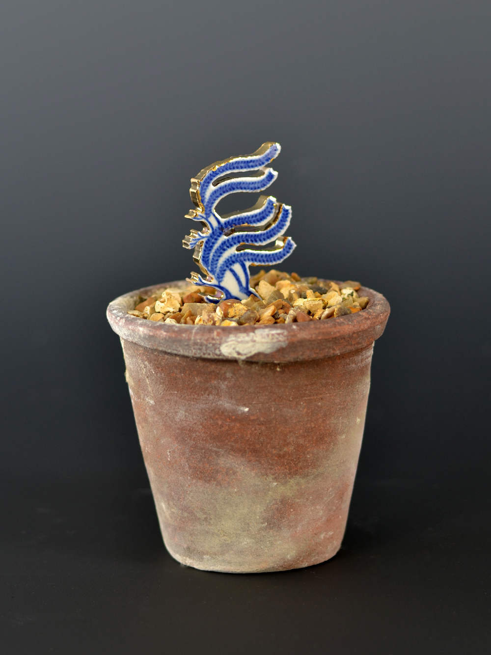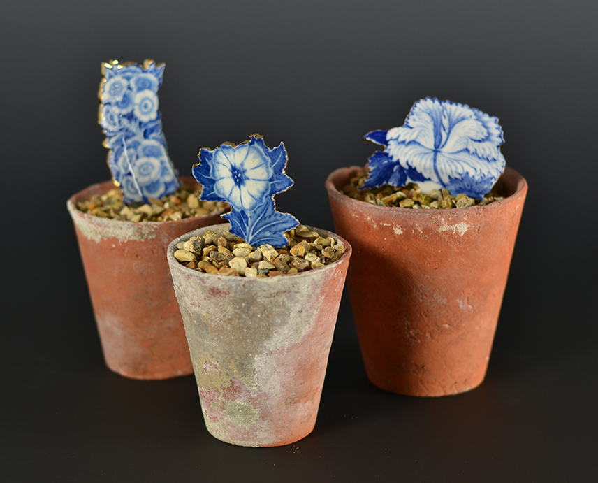 Details of old willow patterns are naturally slightly abstracted on editing, but a recent invitation to create an installation for Cheeseburn Sculpture Park in Northumberland brought the work into a clear focus. Here I was confronted by the old potting shed and stacks of old terracotta pots. As a result I began harvesting overtly floral details of old transferware borders and the ‘cuttings’ began to take on very clear echoes of my gardening practice. I have ‘planted’ flowers and leaf cuttings in coarse sand (topped with gravel) in old terracotta pots.