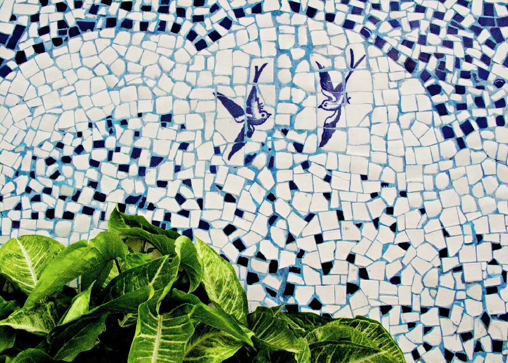 The scanned printed engraving was digitally re-worked to fit a thirty metre length of wall and in Hanoi the artwork was printed onto large rolls of paper. Collaged together in the Mosaic Workshop on Duong Hong Ha, the print-outs formed the base plan for skilled workers to recreate giant white blossoms on a cobalt blue ground. As the artwork took form here was a joyful recognition of the pattern – it represents springtime in South East Asia.
