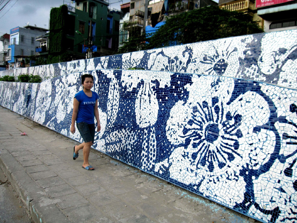 The Red River descends from Yunnan, a mountainous region in Southern China and meanders over 600 miles before dying in Vietnam – in the beautiful Ha Long Bay. Located slightly inland, Hanoi sits on the rich river delta, protected by the Red River Dike – its origins stretching back to the eleventh century. The top of its banks have long functioned as a major transport artery and today the streets of Au Co, Tran Nhat Duat, Tran Quang Khai and Yen Phu are some of city’s busiest highways. Until recently a grim graffiti strewn concrete faced brick wall was all that lined the road – protecting the city’s residents from some of the noise and pollution of Hanoi’s infamous traffic, but in 2007 its facade began to undergo a fundamental change. Inspired by Antoni Gaudi’s Park Güell in Barcelona, and Vietnam’s long ceramic history, Artist and journalist Nguyen Thu Thuy developed the idea of a huge collaborative artwork that would transform the wall she passed each day on her way to work.