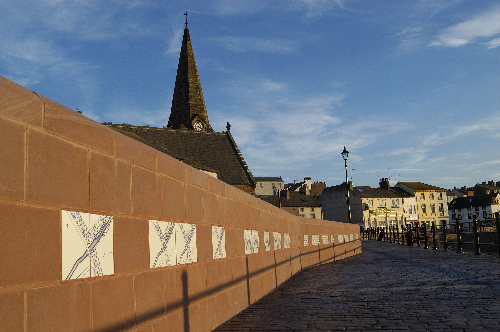 Commissioned to create an artwork involving the sandstone flood defence wall, consultations took place with the townspeople, who were asked to provide images of the town, recollections and memories. Further research involved the town’s Maritime and Senhouse (Roman) Museums, and the Cumbria County Council archive at Carlisle Library.