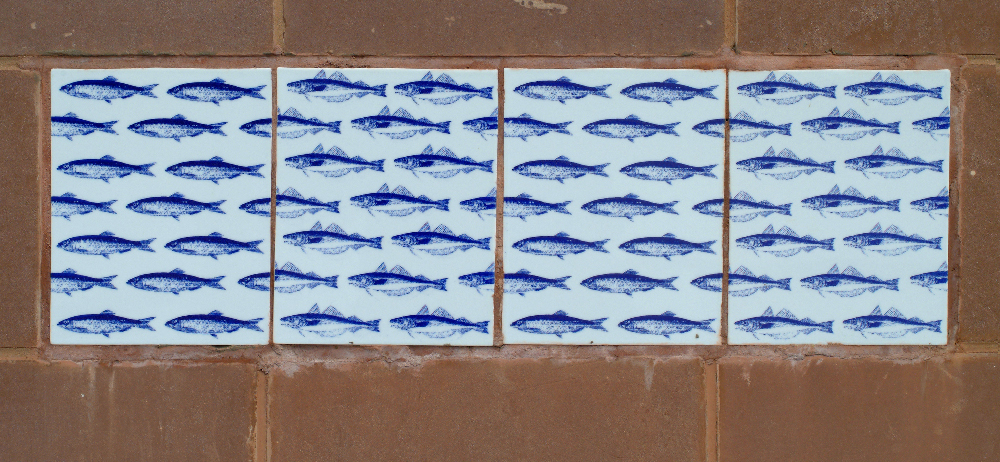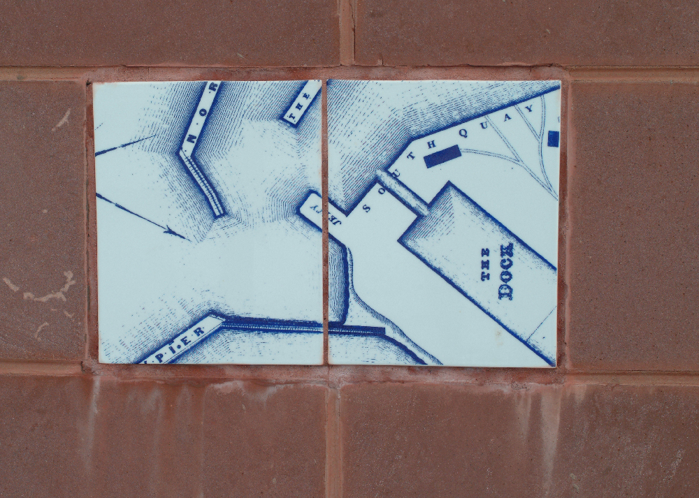 The tile commission for North Harbour flood defence wall is a patterned narrative based on elements of the town’s history. Screen-printed in-glaze cobalt blue images and patterns on porcelain tiles, inset into the sandstone wall, they are a permanent installation, which should last for hundreds of years…