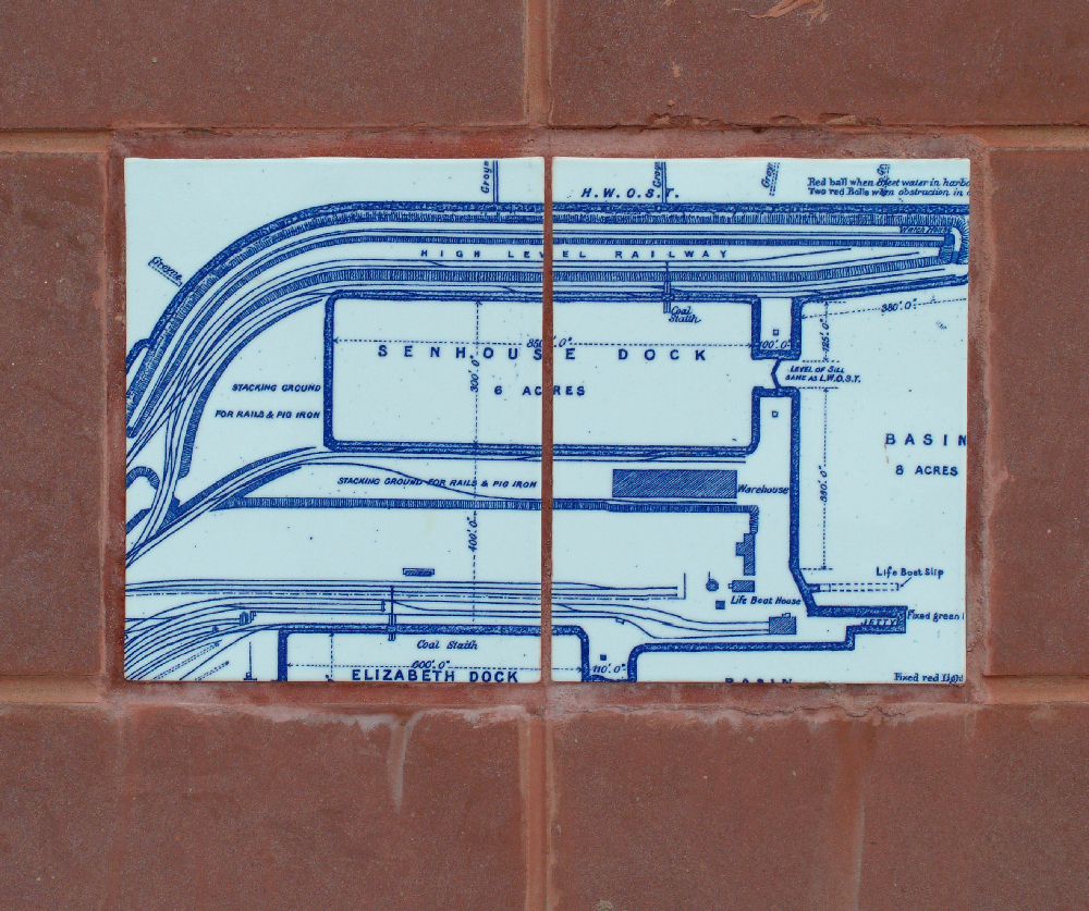 Throughout the mural, repeated details of old maps make patterns on a larger scale, referencing changed places; the location of old shipyards, railway lines and evidence of other activities and presences, which enabled the town to develop.